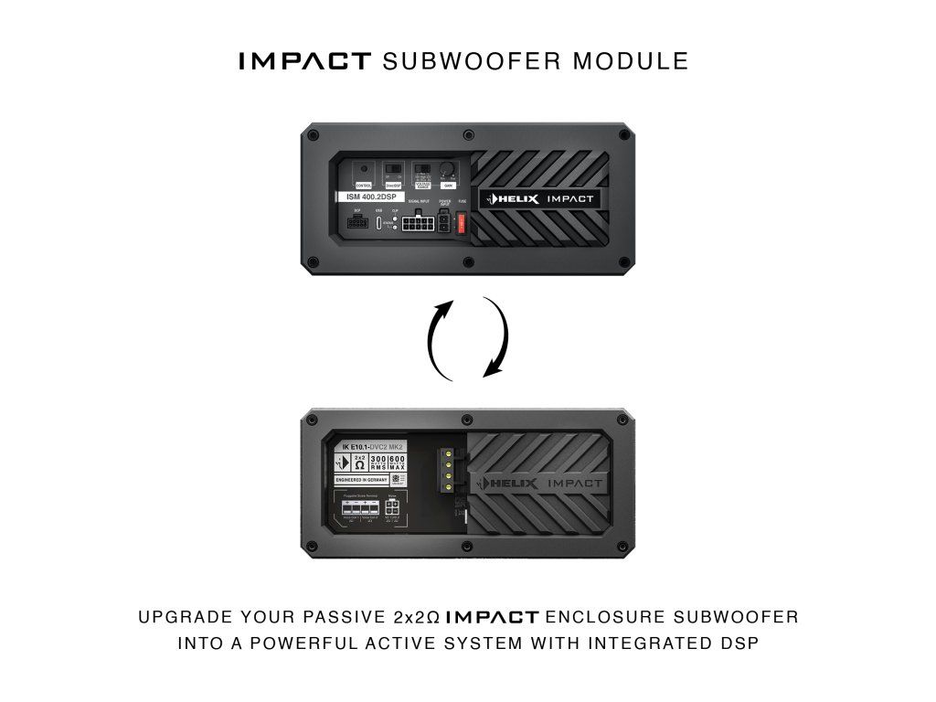 ISM 400.2DSP umožňuje přeměnit pasivní subwoofery s impedancí 2 x 2 Ω „ISM-ready“ na aktivní řešení pouhou výměnou připojovací svorkovnice. Pro efektivní zahájení ladění zvuku jsou v DSP PC-Tool 6 k dispozici také vhodné předvolby pro subwoofery IMPACT.