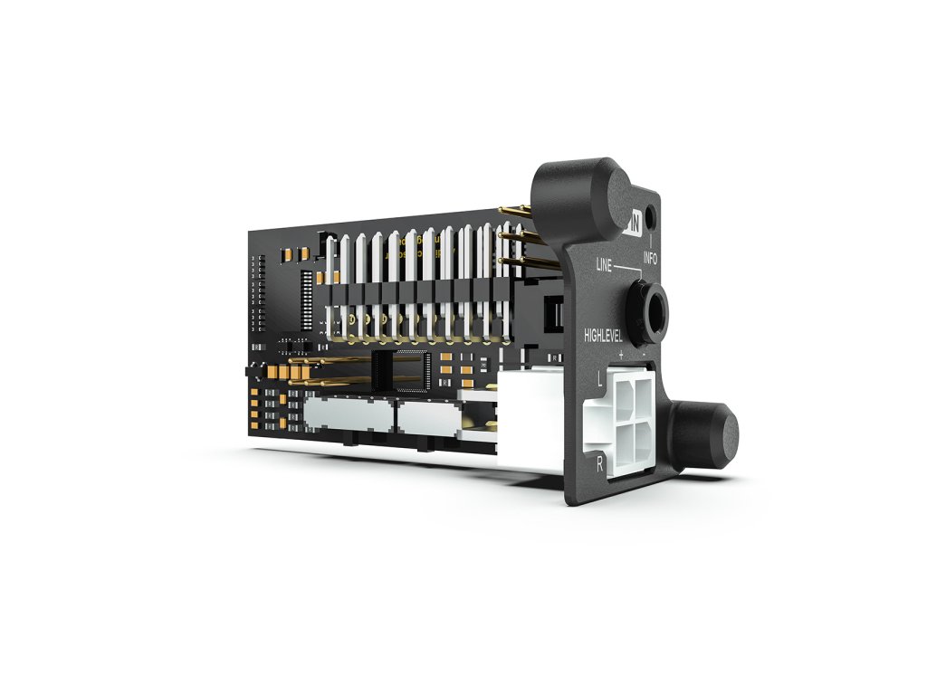 Vysoce kvalitní vysokoúrovňový vstup s obvodem ADEP.3, funkcí Auto Remote a nastavitelnou vstupní citlivostí od 1,5 do 30 V zajišťuje bezproblémovou integraci s hlavními jednotkami OEM nebo továrními zesilovači. Pro zdroje signálu s nízkoúrovňovým výstupem nabízí modul další 3,5mm stereo vstup s nastavitelnou vstupní citlivostí od 0,5 do 8 V.